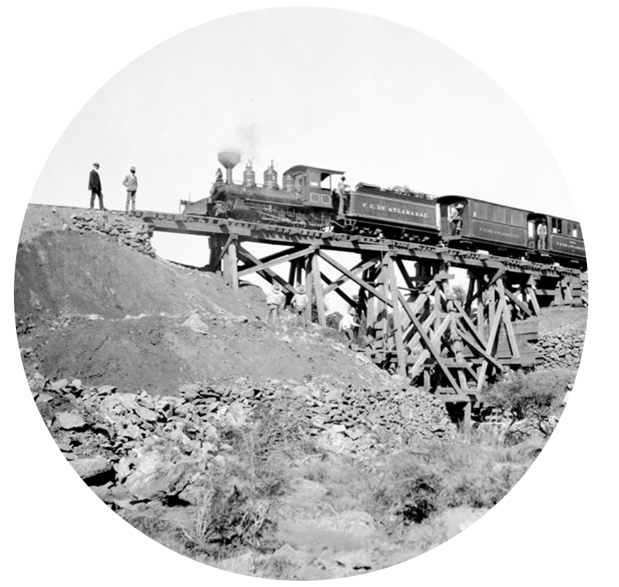 Después de varios intentos desde que se otorgó la primera concesión a Don Francisco de Arrillaga en 1837, el proyecto ferroviario de los hermanos Manuel y Antonio Escandón comenzó a hacerse realidad a partir de 1861. La primera ruta de nuestro país quedó concluida el 1 de enero de 1873, bajo la razón social de Ferrocarril Mexicano, con 423 kilómetros de vías férreas entre la Ciudad de México y el Puerto de Veracruz. Se eligió el antiguo camino de Orizaba, desafiando lo accidentado de la Barranca de Metlac y las Cumbres de Maltrata. Se tendieron las vías con la firme convicción de que podrían vencerse los obstáculos que la naturaleza imponía, lo cual fascinó a los artistas decimonónicos, quienes plasmaron las grandes obras de ingeniería integradas al conjunto de los paisajes.