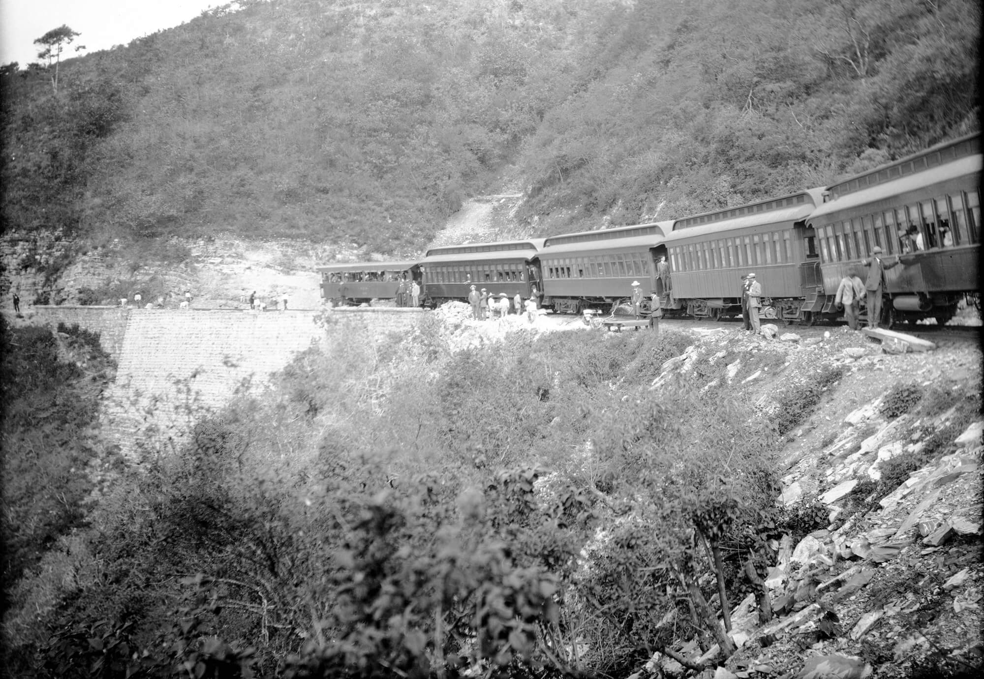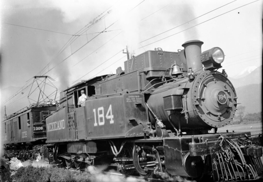 Se puede observar en primer plano la locomotora a vapor tipo Fairlie de doble caldera y al fondo la locomotora General Electric, ambas fueron construidas especialmente para el Ferrocarril Mexicano.
