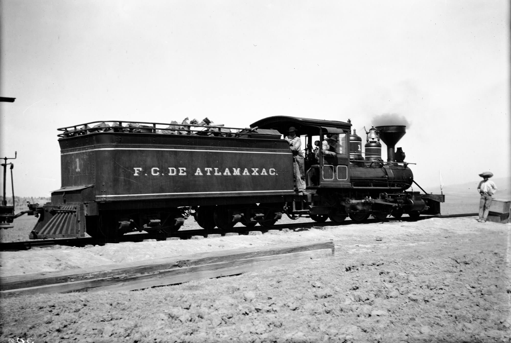 Locomotora de vapor del ferrocarril de Atlamaxac, ca. 1909.
