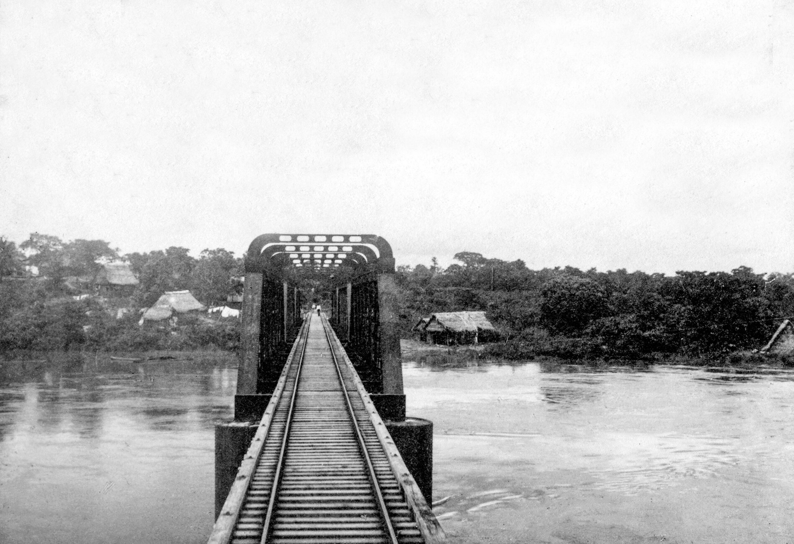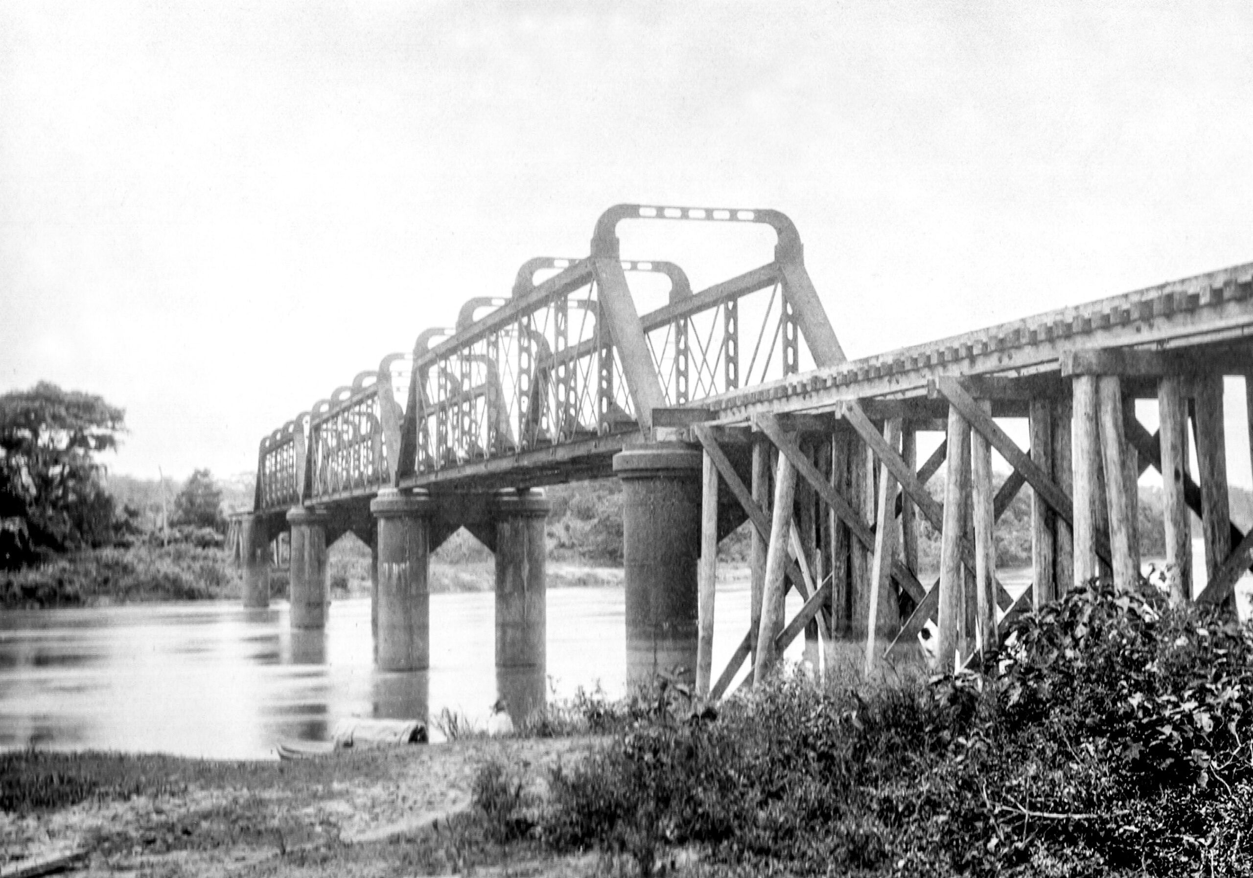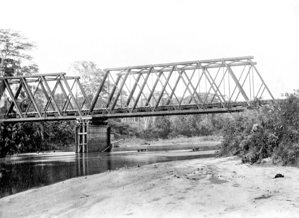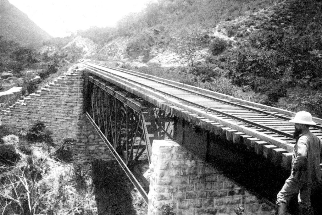 Ferrocarril de Tehuantepec en el río Sarabia Álbum:Las obras del Puerto de Veracruz y el Istmo de Tehuantepec desde el Atlántico al Pacifico, 1897.