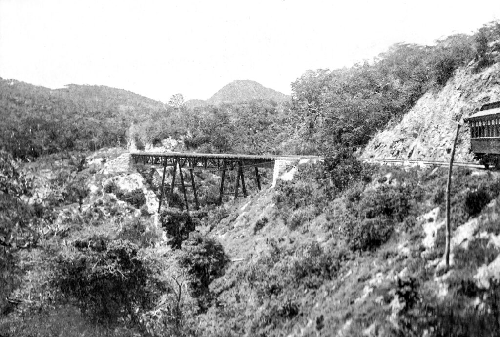 Vista del ferrocarril de Tehuantepec en el cañón de Matengo Álbum:Las obras del Puerto de Veracruz y el Istmo de Tehuantepec desde el Atlántico al Pacifico, del año 1897.